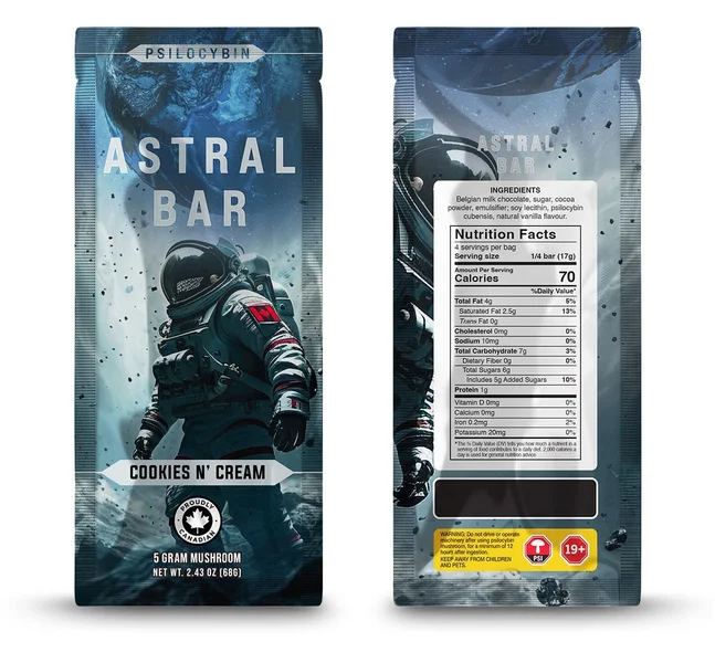 Embark on a cosmic journey with Astral Bars, the psilocybin chocolate bars that will transport you to the far reaches of the universe with the help of 5 psilocybin grams derived from 5 distinct magic mushrooms strains: